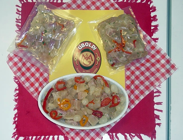The tendons are cut and dressed with oil, vinegar, peppers, small onions, parsley. The product is vacuum-packed into packets of Kg. 0,5. The box holds 16 packets.